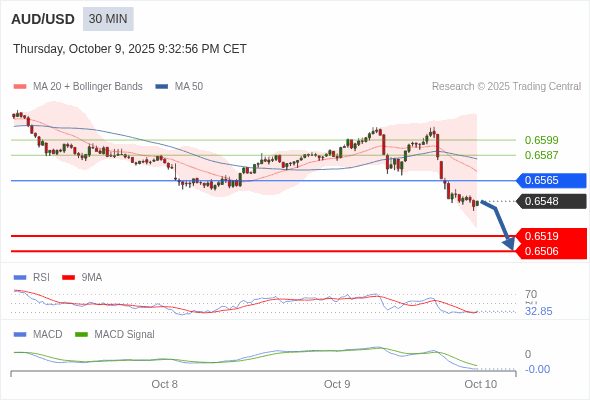 澳元/美元 当日内 : 看跌,在 0.6565 之下。