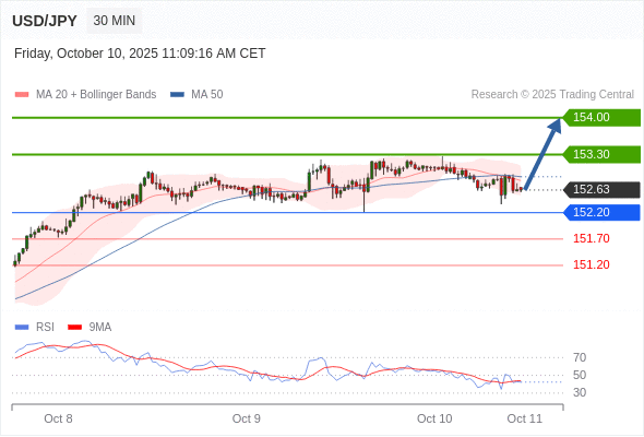 在 152.20 之上,看涨,目标价位为 153.30 ,然后为 154.00 。