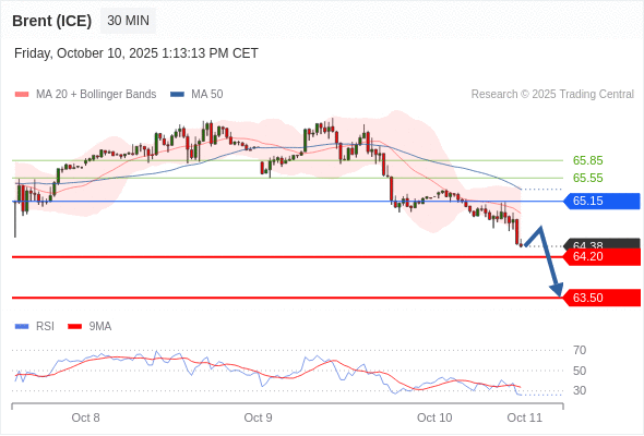 在 65.15 之下,看跌,目标价位为 64.20 ,然后为 63.50 。