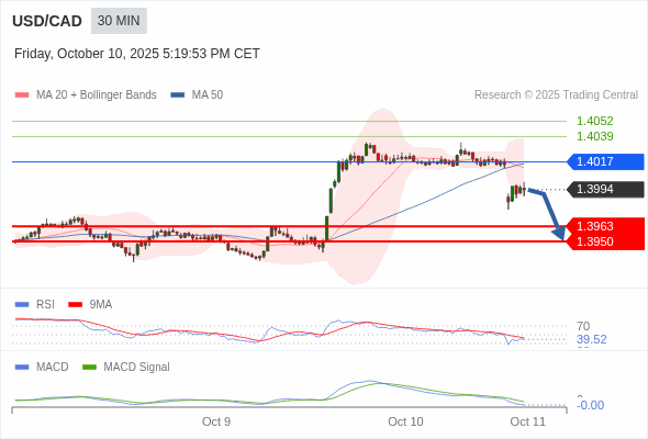 美元/加元 当日内 : 看跌,在 1.4017 之下。