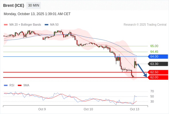 布伦特原油 (ICE) (Z5) 当日内: 短期关键阻力位在64.00。
