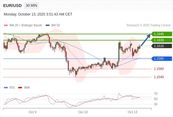 在 1.1585 之上,看涨,目标价位为 1.1630 ,然后为 1.1645 。