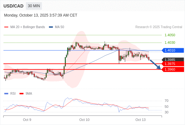 在 1.4010 之下,看跌,目标价位为 1.3975 ,然后为 1.3960 。