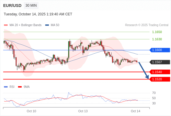 在 1.1600 之下,看跌,目标价位为 1.1540 ,然后为 1.1520 。