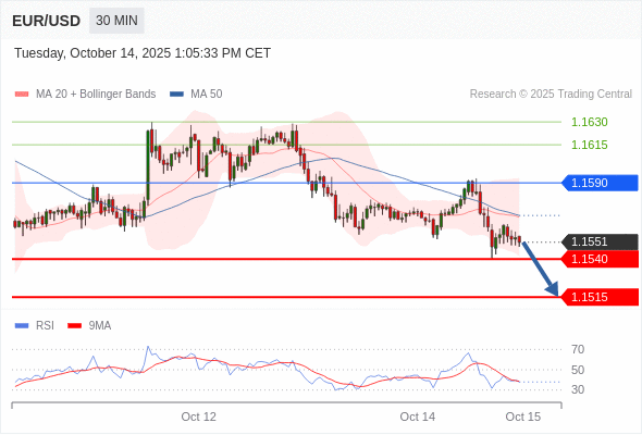 在 1.1590 之下,看跌,目标价位为 1.1540 ,然后为 1.1515 。