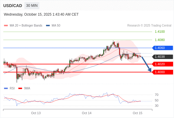 在 1.4060 之下,看跌,目标价位为 1.4020 ,然后为 1.4000 。