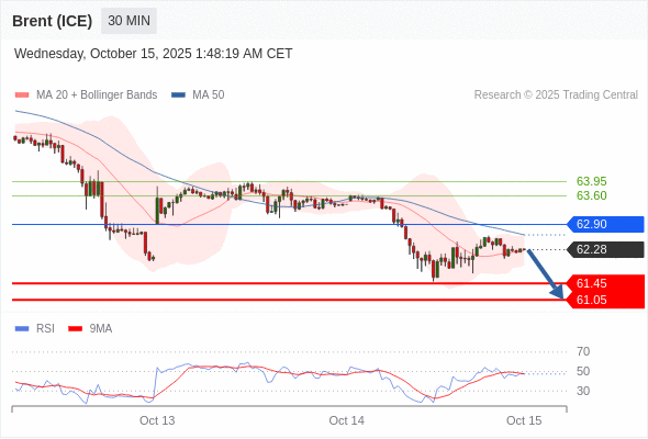 布伦特原油 (ICE) (Z5) 当日内: 短期关键阻力位在62.90。