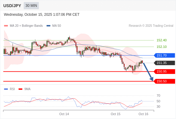 在 151.70 之下,看跌,目标价位为 150.95 ,然后为 150.50 。