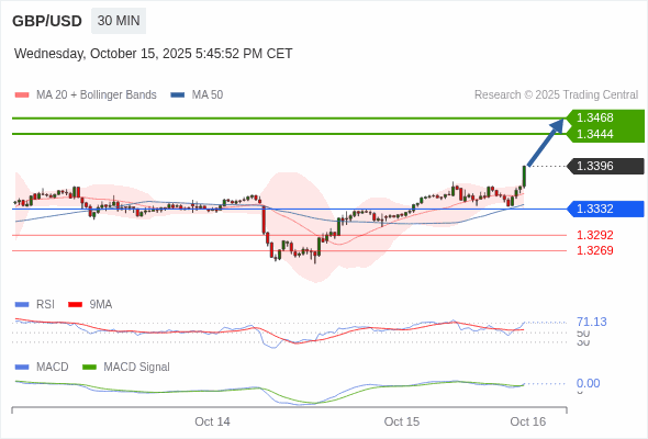 英镑/美元 当日内 : 看涨,当 1.3332 为支撑位。