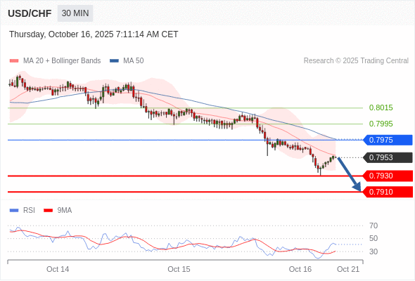 在 0.7975 之下,看跌,目标价位为 0.7930 ,然后为 0.7910 。