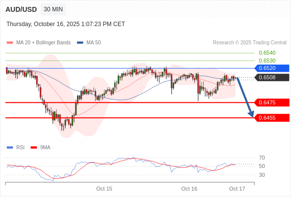 在 0.6520 之下,看跌,目标价位为 0.6475 ,然后为 0.6455 。