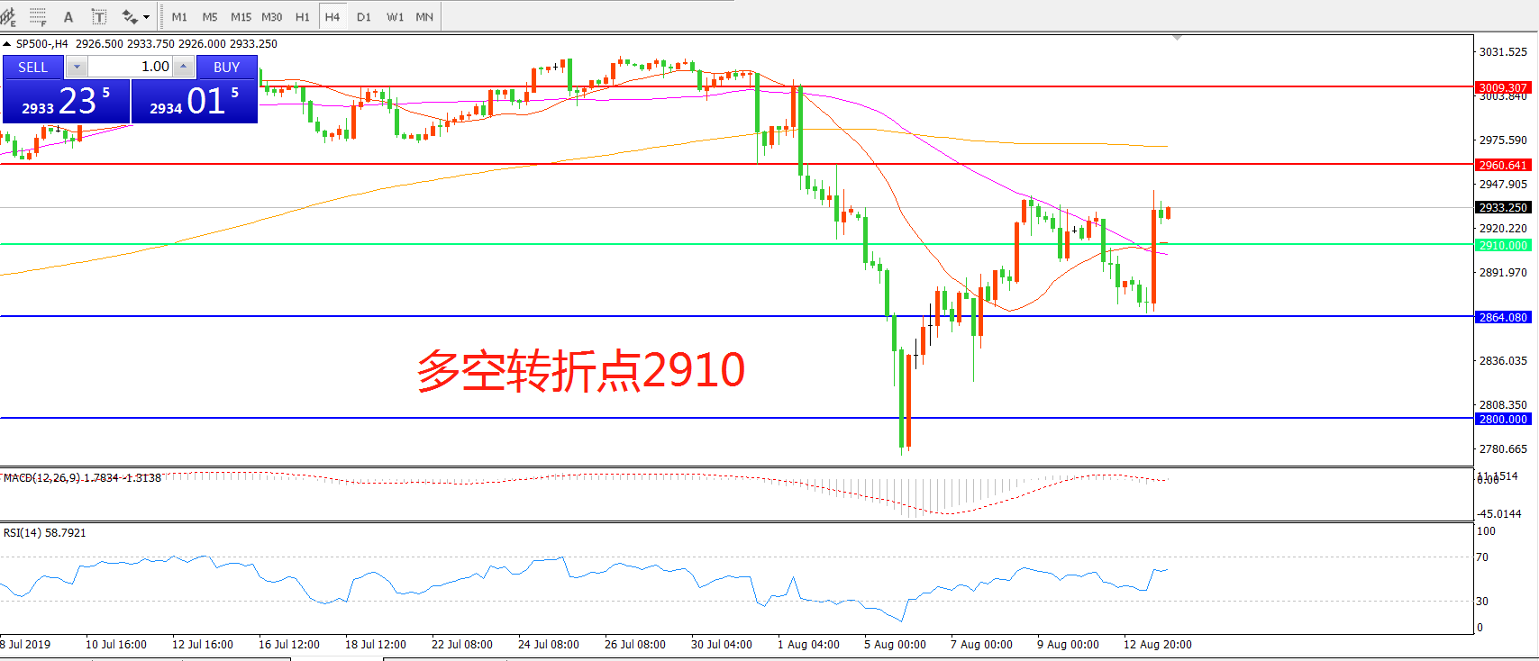 周二(8月13日),美国宣布将推迟对部分中国产品征收关税,并宣布双方同意继续进行贸易谈判。双方约定在未来两周内再次通话,中美贸易局势的缓和将对经济与股市产生利好,美股一扫连续大跌的阴霾,三大股指悉数大涨,标普500长阳上升,最终收报2932.5点。科技股、中概股普涨 ,苹果公司涨逾4%领涨,高通涨逾3%,亚马逊涨逾2%。
