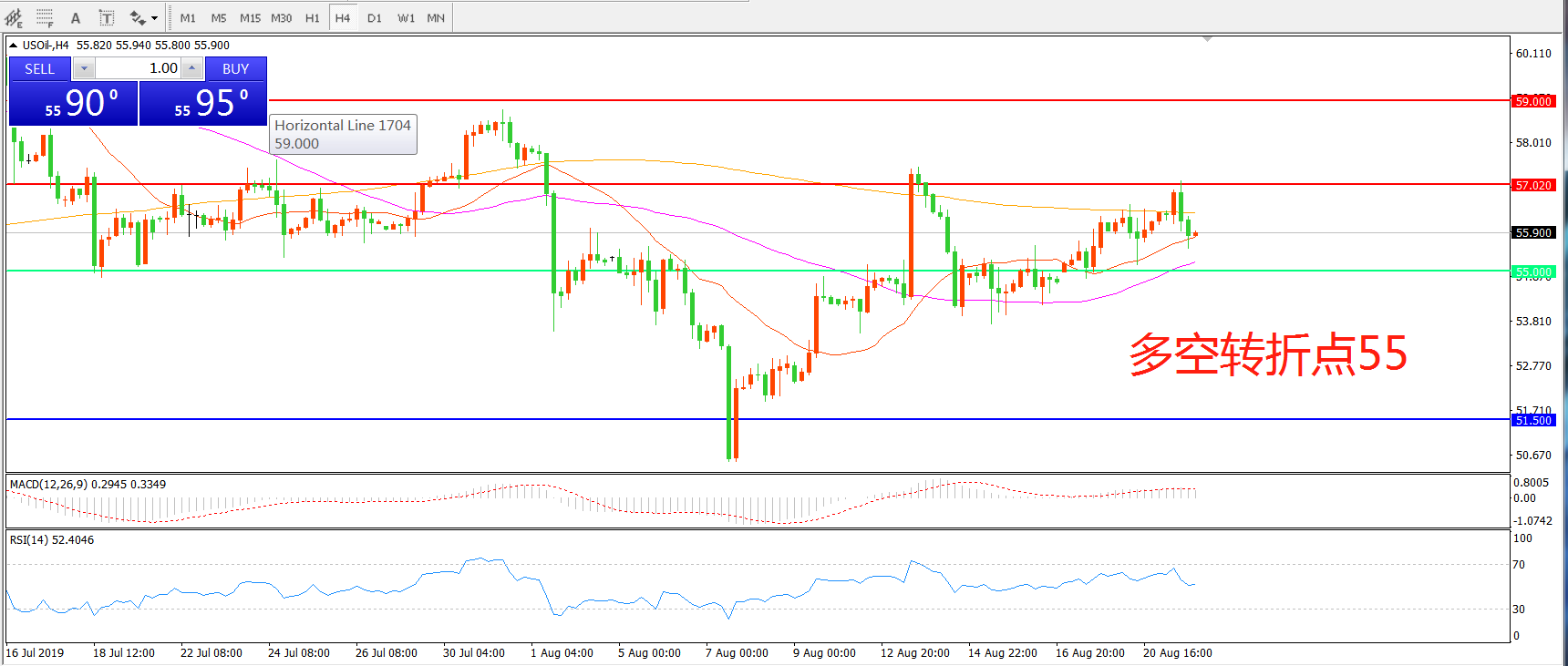 4小时图看,油价整体维持宽幅震荡形态,均线系统逐渐拐头形成下方支撑,57阻力依然未能突破,MACD红柱增加, RSI指标走平,日内维持震荡概率较大。