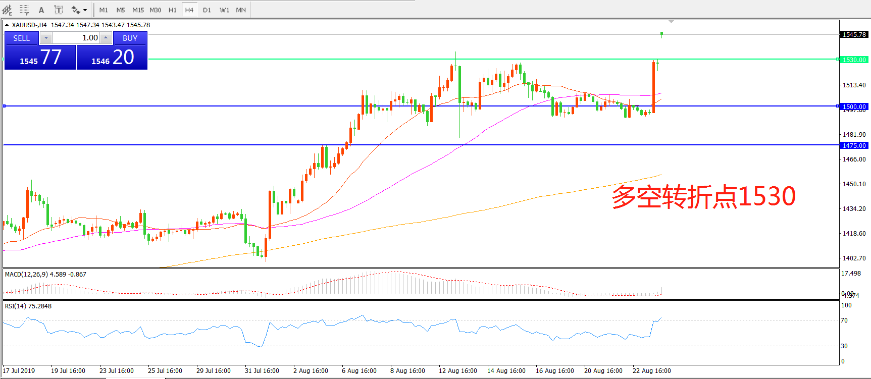 上周市场的主要焦点都放在杰克逊霍尔年会上美联储主席鲍威尔的讲话上,即使美联储会议纪要略微偏向鹰派,都没有引起金价太大的波动,但在美联储主席周五讲话前两小时,国务院发出公告,中方决定对美750亿美元商品加征关税,市场瞬间掀起波涛汹涌,美股、美元暴跌,金价则获得了强劲的上涨动能,最终收报1527.31美元/盎司。