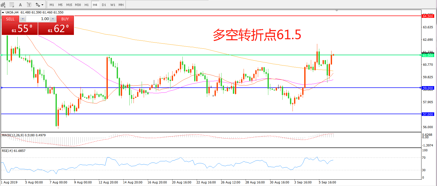 4小时图看,油价回踩均线系统形成的支撑后长阳拉升,整体表现十分强势,目前再次到达61.5美元附近,MACD红柱增加,RSI指标向上,日内延续上行概率较大。