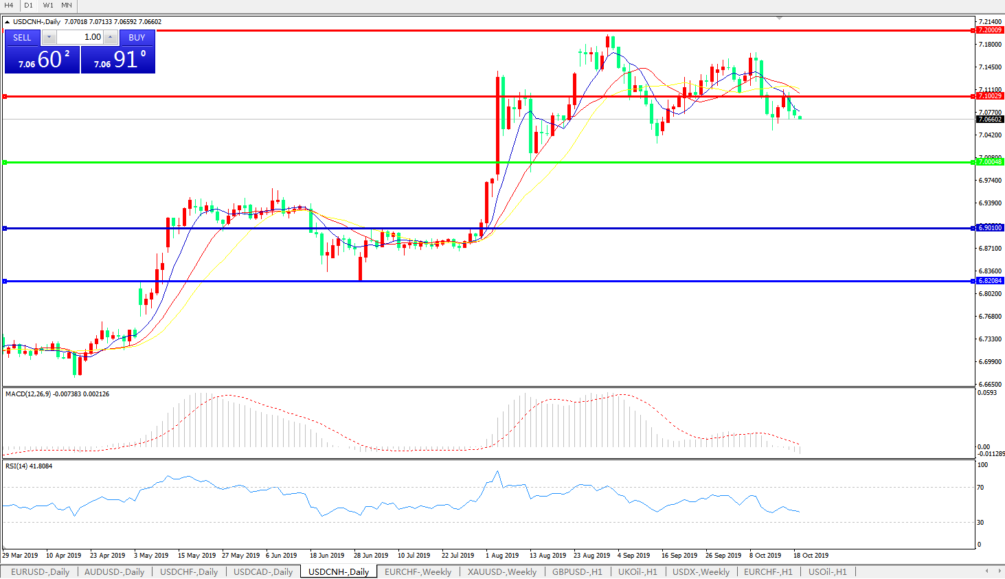 技术面简析:日图短期均线呈空头排列,汇价7.10关口承压小幅回落下行,MACD快速逼近0轴且量能0轴下方放量,RSI再度走低,预计短期汇价将延续宽幅整理态势,汇价运行于7.00-7.10区间的概率较大;中美贸易后续谈判进展将决定汇价最终趋势。