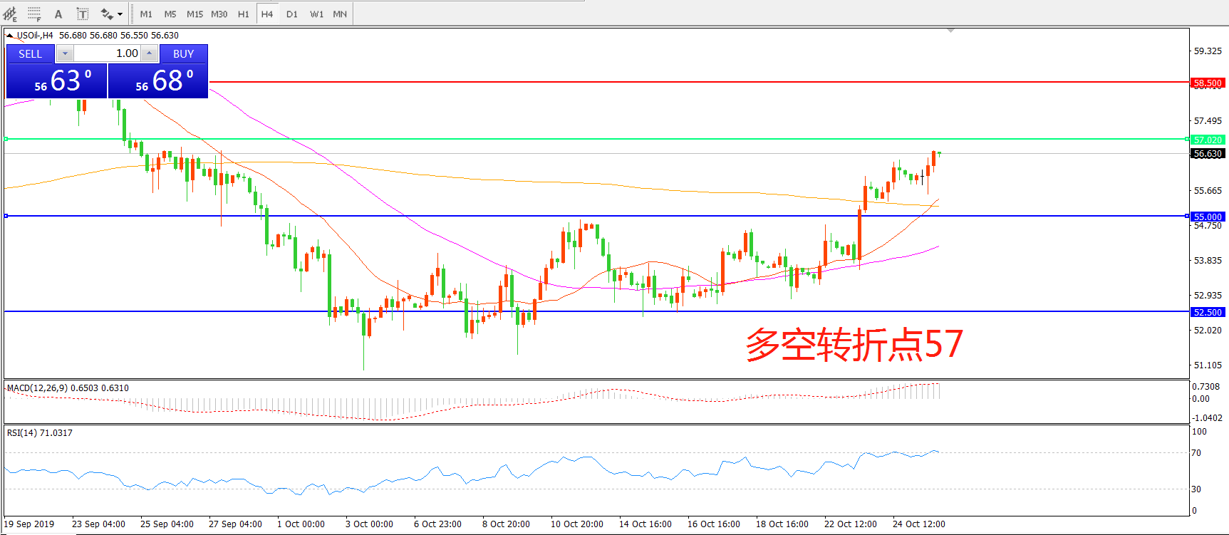 4小时图看,油价站稳200周期均线后强势上行,阳线连续拉升之后逼近57美元阻力,短期均线拐头向上,MACD红柱增加,RSI指标走平,日内延续上行概率较大。