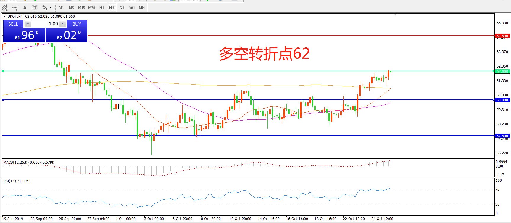 4小时图看,油价站稳200周期均线后强势上行,阳线连续拉升之后逼近62美元大关,短期均线拐头向上,MACD红柱增加,RSI指标走平,日内延续上行概率较大。