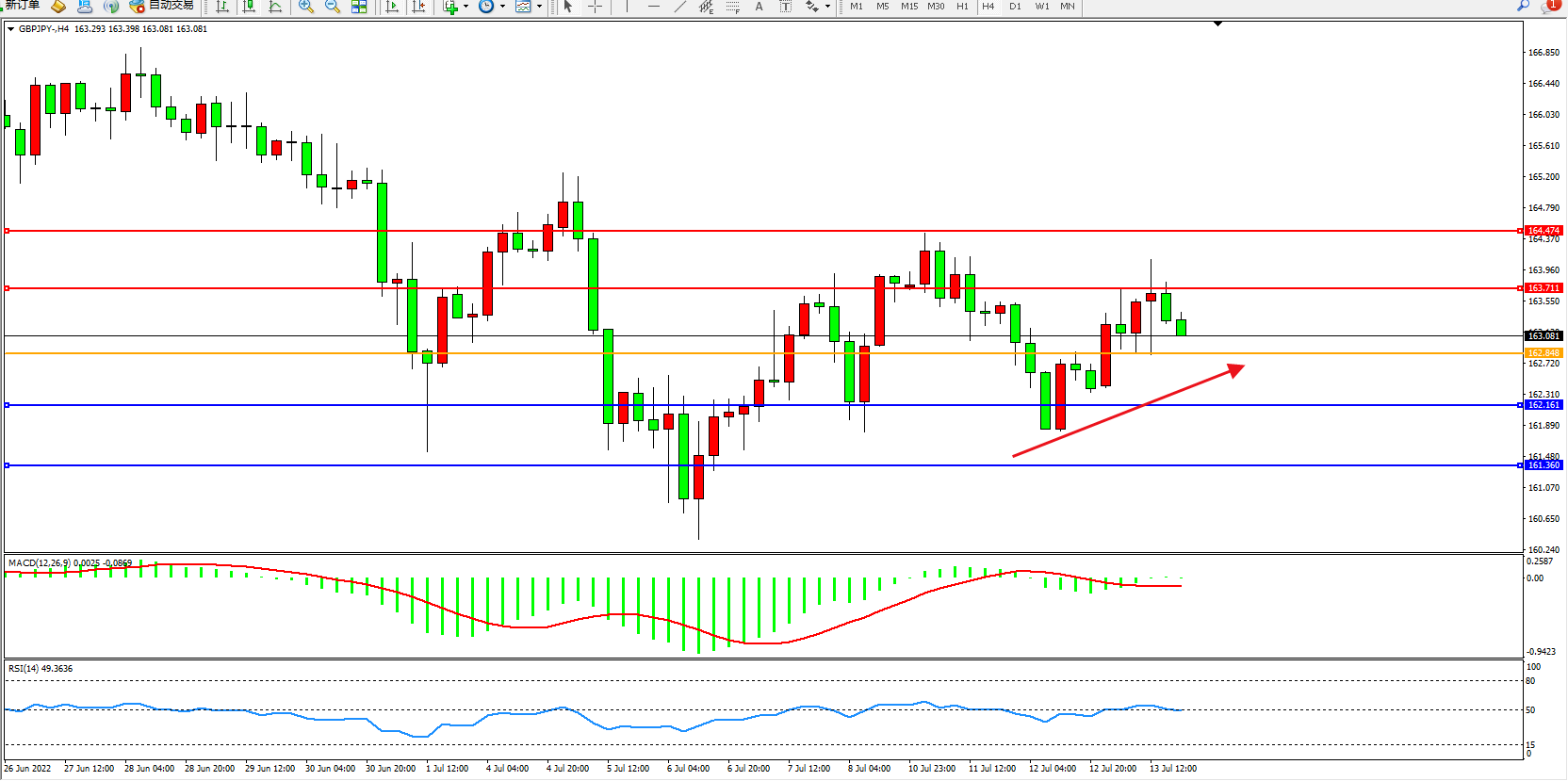4小时图看:低位宽幅区间震荡后,波幅空间逐渐收窄,多头动力有伺机入场迹象,MACD指标处于0轴线附近弱势徘徊,RSI指标处于50均衡线附近窄幅整理;