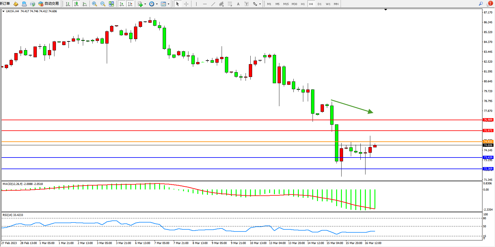 4小时图看:空头动力持续下挫后,低位窄幅震荡,市场持续低位窄幅整理,MACD指标处于空头区域低位徘徊,RSI指标处于低位弱势窄幅整理;
