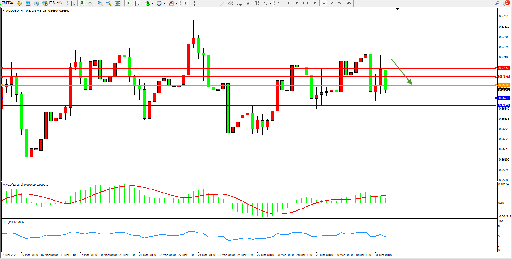 交易策略:0.66886下方看跌,目标0.66749 0.66671