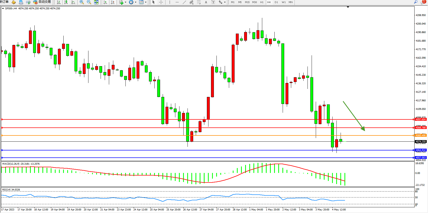 标普500指数5月4日(周四)收盘下跌30.15点,跌幅0.74%,报4060.60点;美国至4月29日当周初请失业金人数 24.2万人,预期24万人,前值23万人。美国初请失业金人数创下6周来最大增幅,表明美国劳动力市场出现了一些疲软,但仍相对具有弹性。