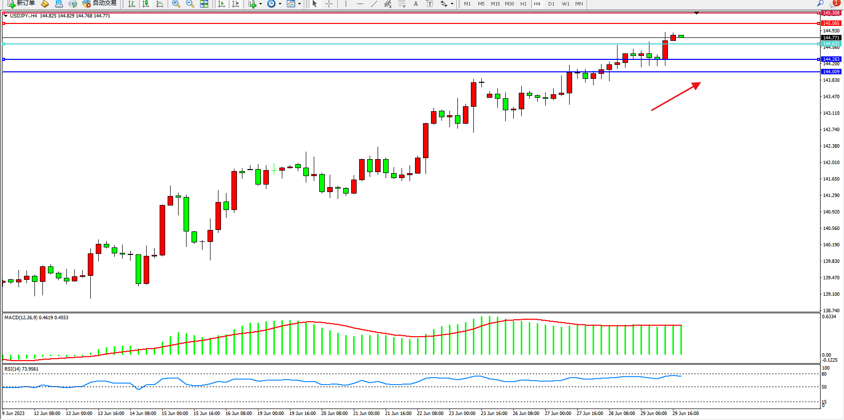 4小时图看:多头动力高位震荡上移,短期看涨情绪持续,市场多头不断攀升中,MACD指标处于多头区域维持整理,RSI指标处于多头区域高位震荡;