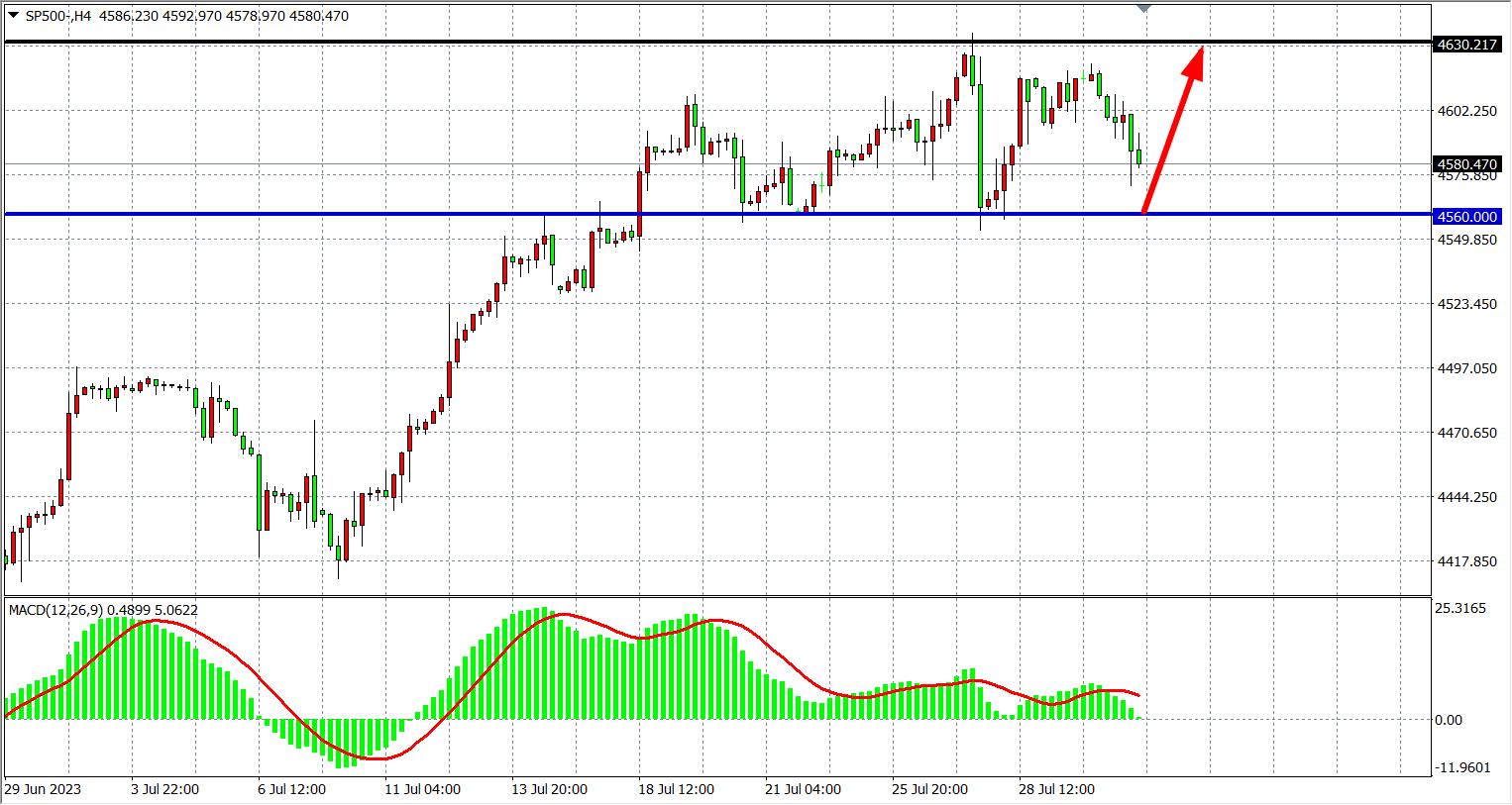 4小时图看,标普在高位宽幅整理,MACD量能在零轴上缩量,支撑关注4595-4560附近,上方阻力4630-4660。