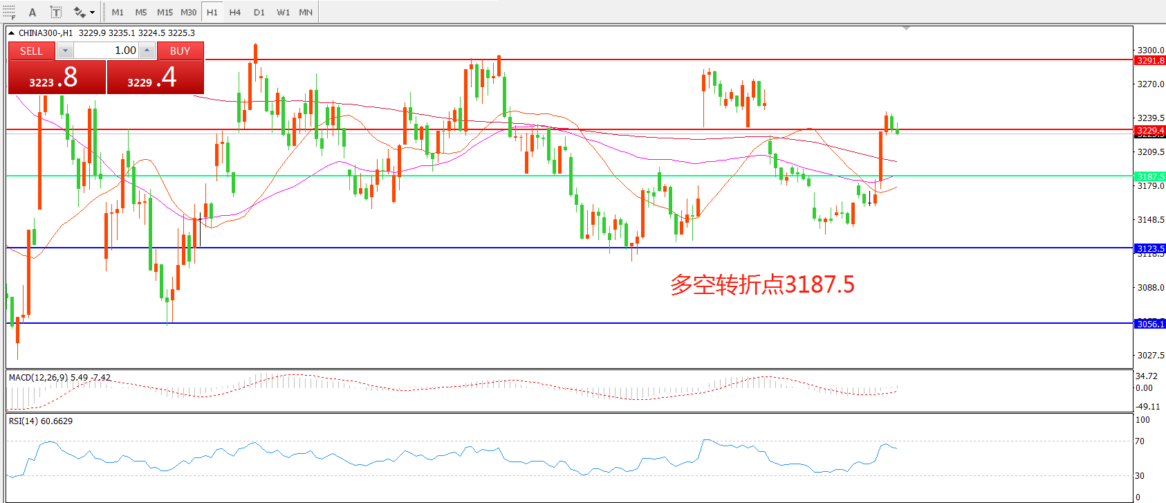 1小时图看,CHINA300中华指数上穿多根均线收阳,整体价位位于3187.5之上, MACD绿柱缩短,红柱增加,RSI直指标有拐头迹象,日内走势仍以箱型整理为主。
