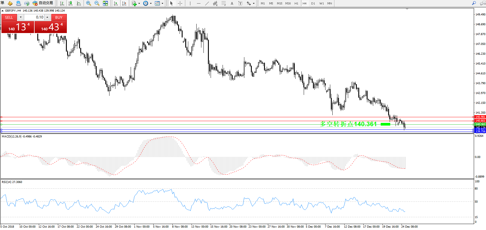 交易策略:140.361下方看跌,目标139.932、139.756