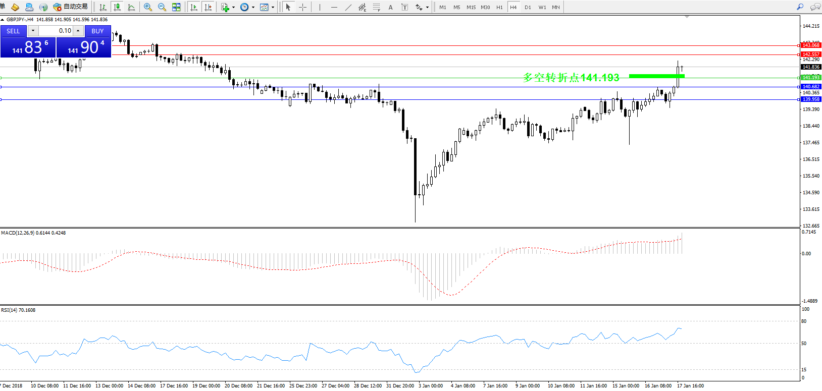 交易策略:141.193上方看涨,目标142.557143.068