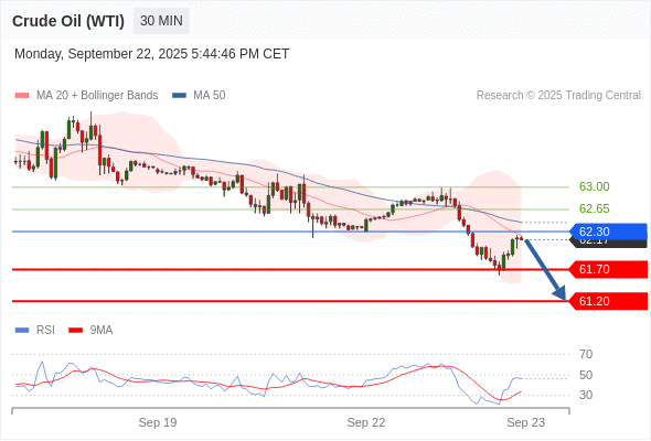 在 62.30 之下,看跌,目标价位为 61.70 ,然后为 61.20 。