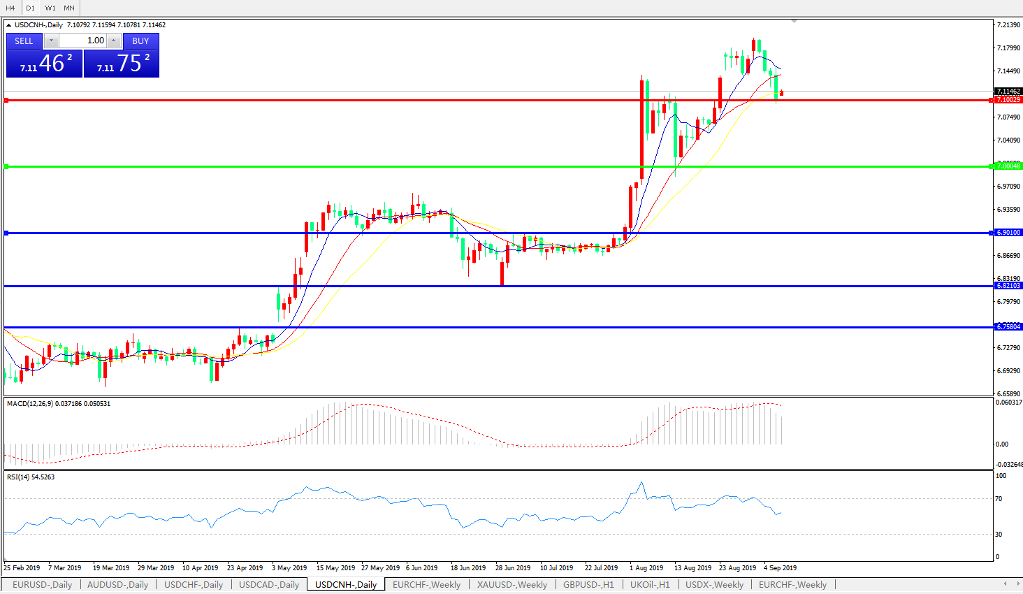 技术面简析:日图均线呈有序多头排列但短期均线开始转弱,汇价周五走低早盘小幅回升,MACD运行在0轴上方但动能有缩量迹象,RSI自超买区域持续下行,预计短期汇价将继续回落下行,上方重点关注7.20-7.30区间的压制;中美贸易谈判后续进展决定汇价中期走势。